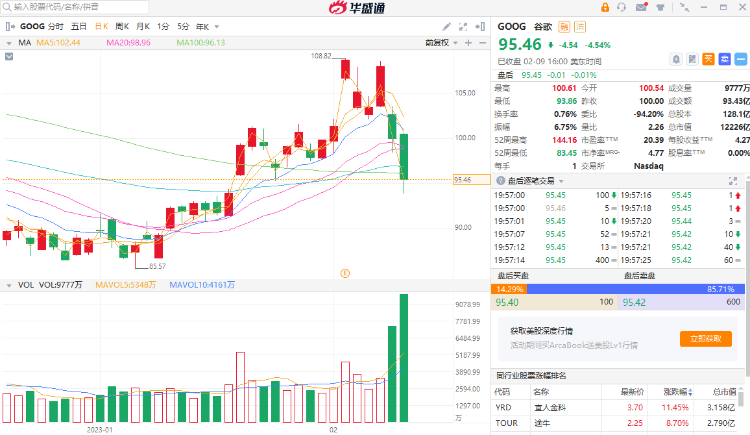 不过,从微软和谷歌对垒的初步战况来看,似乎是微软更胜一筹。作为ChatGPT的受益方,微软市值本周一度重回2万亿美元,为去年8月来首次。而谷歌却因新推的“Bard”犯了事实性错误,周三股价暴跌近8%。截至周四美股收盘,谷歌股价再跌4.39%,报95.01美元。