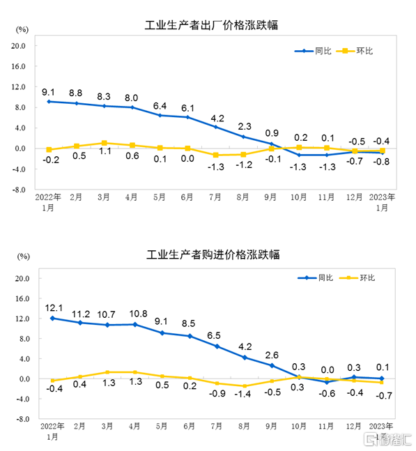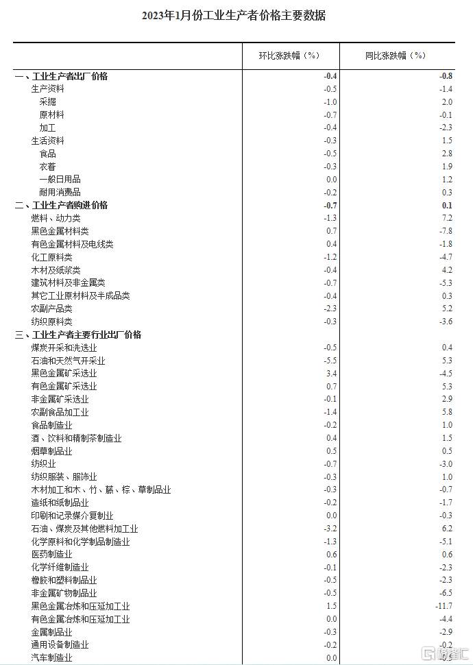 PPI方面,工业生产者出厂价格同比下降0.8%,环比下降0.4%;工业生产者购进价格同比上涨0.1%,环比下降0.7%。