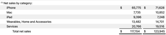 从产品线来看,除了iPad和服务分别同比增长近30%和6.4%外,其他均处于下滑态势。其中自iPhone的营收为657.75亿美元,同比下滑超8%;来自Mac的营收为77.35亿美元,同比下滑28.72%;来自可穿戴设备、家居产品和配件的营收为134.82亿美元,同比下滑8.29%。