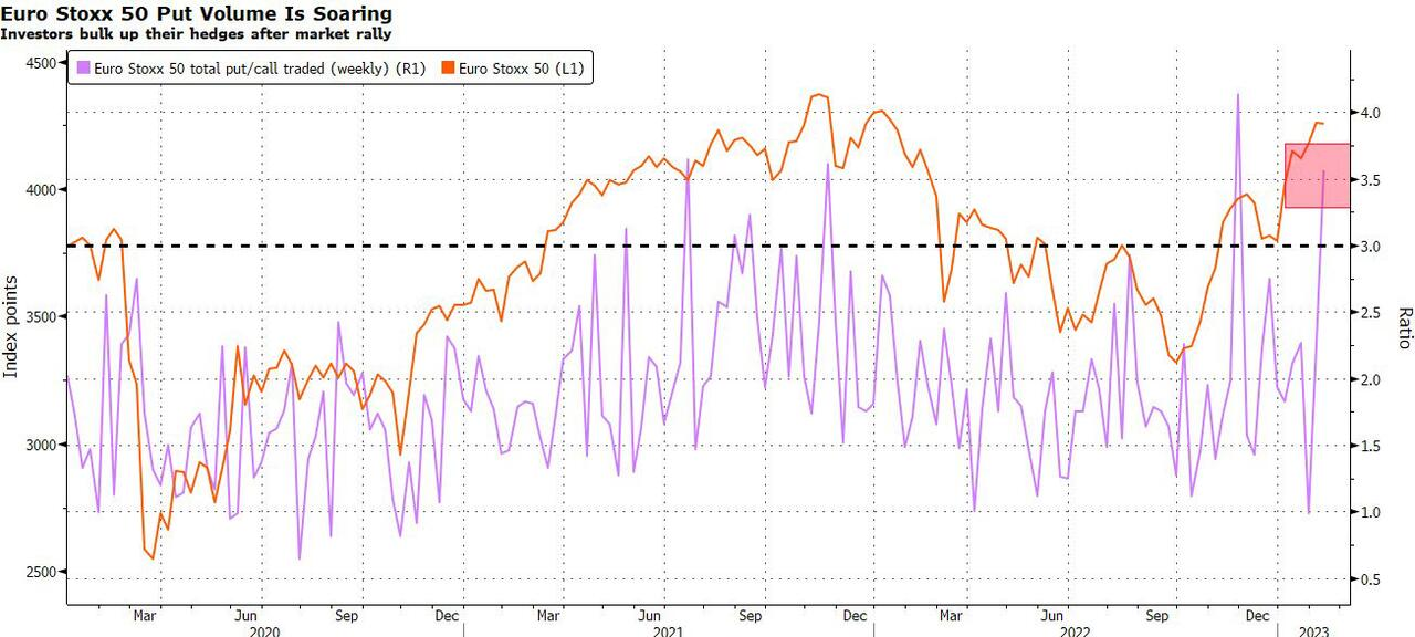 在一些投资者追逐涨势的同时,其他投资者正在加强对冲,并关注未来仍存在的风险。本周Euro Stoxx 50的看跌期权交易总数是看涨期权交易数量的三倍多,这种情况相对罕见。与此同时,股市的整体仓位仍然很低,这也是市场至少能在几周内保持上涨的一个很好的理由。