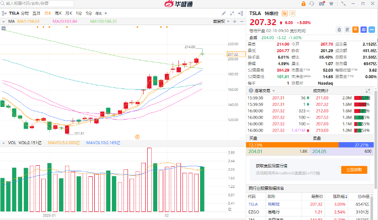 截至周四(2月9日)收盘,该公司股价上涨3%,收于美股207.32美元。今年迄今,该公司股价已上涨68.3%,而相较于1月6日的盘中低点,该股已上涨103.6%。