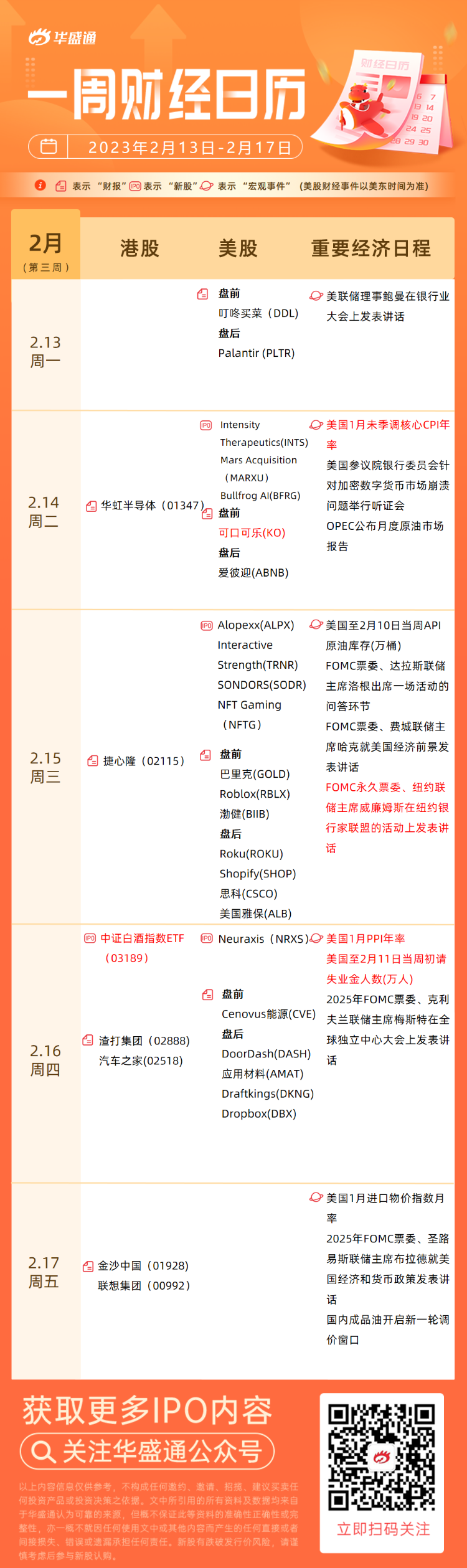 美股新股方面,本周预计有八只新股上市。Intensity Therapeutics( $INTS )、Mars Acquisition( $MARXU ) 、Bullfrog AI( $BFRG ) 、SONDORS( $SODR ) 、Alopexx( $ALPX )、 Interactive Strength( $TRNR )、NFT Gaming( $NFTG )、Neuraxis( $NRXS ) 。