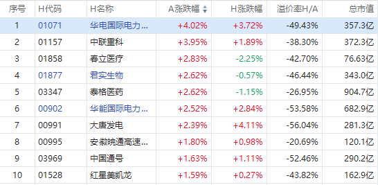 截至发稿,华电国际电力股份A股涨4.02%,H股现涨3.72%;华能国际电力股份A股涨2.52%,H股涨2.84%;君实生物A股涨2.62%,H股跌0.57%。
