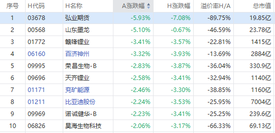 弘业期货A股跌5.93%,H股跌7.08%;赣锋锂业A股跌3.41%,H股跌3.57%;百济神州A股跌3.32%,H股跌3.93%。