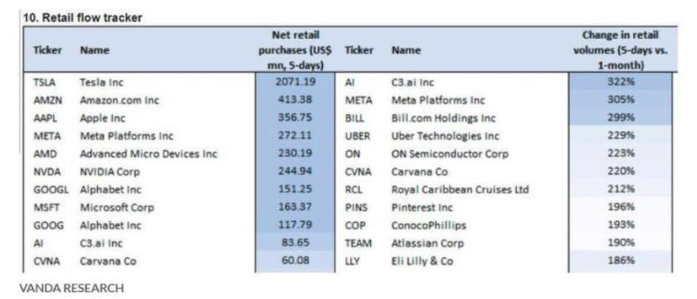 据Vanda Research的数据显示,美国股市的散户投资者流入量达到2020-2021年的水平,特斯拉是散户热衷的主要标的。