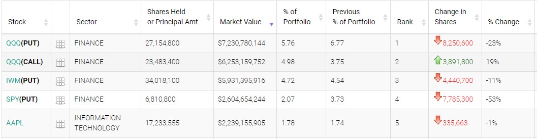 在前五大重仓股中,纳指100ETF看跌期权(QQQ.PUT.US)位列第一,持仓2715.48万股,持仓市值约为72.31亿美元,占投资组合比例为5.76%。