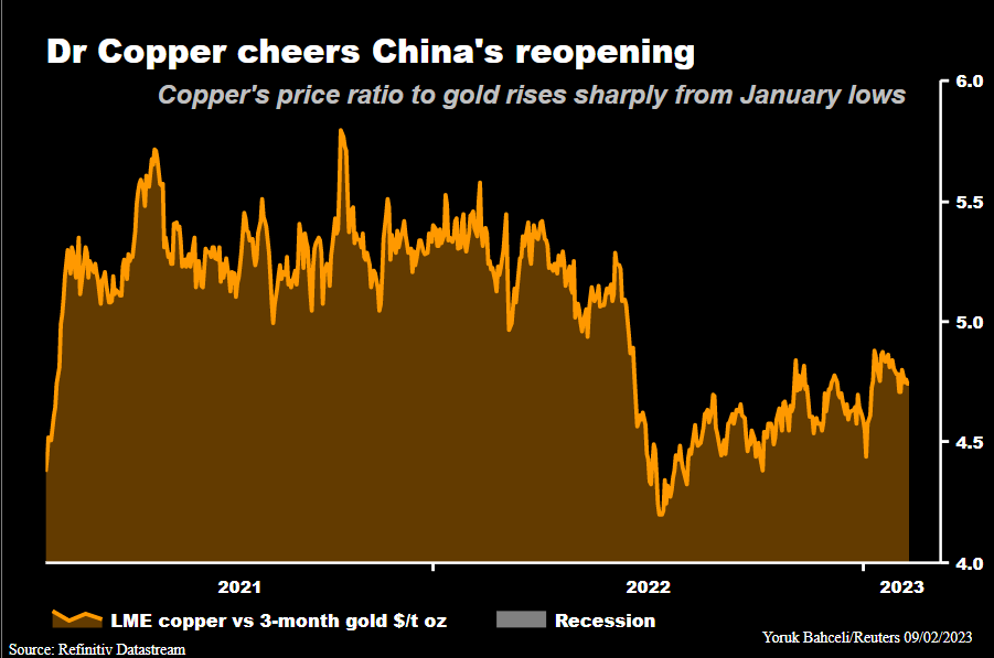 金铜比也从1月份的三个月高点大幅下跌,这显示出投资者正在购买铜并抛售黄金,表明他们对经济前景并不过分担忧。