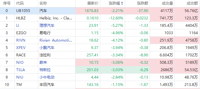 盘面上,汽车股集体回调,理想汽车跌超5%,Rivian $RIVN 跌超4%,小鹏汽车、特斯拉、蔚来现跌超3%。