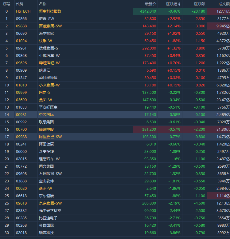 部分科技股逆势走强,蔚来、百度集团涨超2%;快手、哔哩哔哩、华虹半导体、小鹏汽车跟涨。