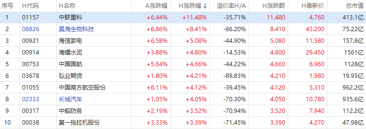 截至发稿,中联重科A股涨6.44%,H股现涨11.48%;昊海生物科技A股涨8.86%,H股涨8.41%;海信家电A股涨6.58%,H股涨5.08%。