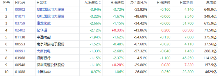华能国际电力股份A股跌3.94%,H股跌3.72%;华电国际电力股份A股跌3.22%,H股跌1.67%;康龙化成A股跌2.66,H股跌1.15%。