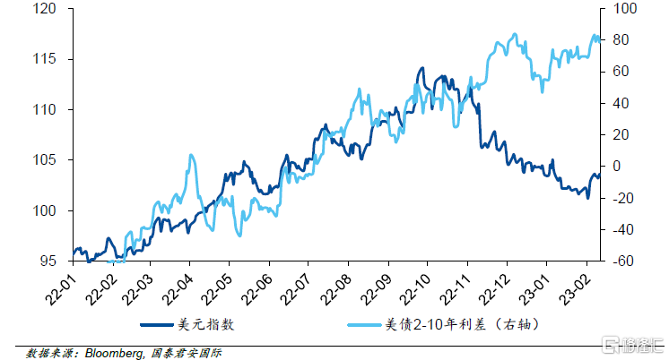 但从金融市场的表现来看,我们会发现一些有趣的现象。比如说,从美元指数的表现来看,从去年的加息周期开始,美元指数与2年-10年国债的利差保持着亦步亦趋的关系,这样的关系在去年11月左右被打破。此后,我们会发现,美元指数走势愈发疲弱,但2年-10年的国债利差却依旧保持在较高的位置上。