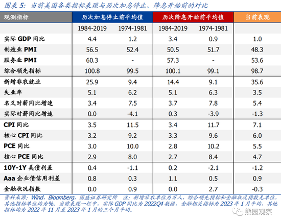 >1981年之后的6轮加息停止前,实际GDP同比平均为4.4%,制造业PMI平均为56.5%,服务业PMI平均为60.3%,综合领先指标平均为100.8。1974-1981年的3轮加息停止前,实际GDP同比平均为1.2%,制造业PMI平均为52.4%,综合领先指标平均为99.5。