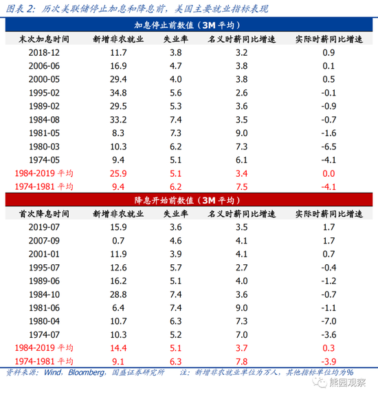 >1981年之后的6轮加息停止前,新增非农就业人数平均为25.9万人,失业率平均为5.1%,名义时薪同比增速平均为3.4%,实际时薪同比增速平均为0.0%。1974-1981年的3轮加息停止前,新增非农就业人数平均为9.4万人,失业率平均为6.2%,名义时薪同比增速平均为7.5%,实际时薪同比增速平均为-4.1%。