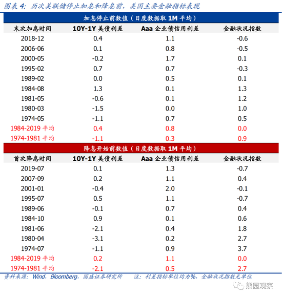 >1981年之后的6轮加息停止前,10Y-1Y美债利差平均为0.4%,Aaa企业债信用利差平均为0.8%,金融状况指数平均为0。1974-1981年的3轮加息停止前,10Y-1Y美债利差平均为-1.1%,Aaa企业债信用利差平均为0.3%,金融状况指数平均为0.9。
