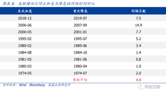 图表6汇总了历次停止加息到降息的间隔时间,从中可以看出,全部9轮周期平均间隔时间在5个月左右,但1974-1984年的4轮周期中,间隔时间均在2个月以内。这表明,高通胀会迫使美联储更晚停止加息,而经济显著恶化则会迫使美联储在停止加息后立刻开始降息,本轮的情况可能与之类似。
