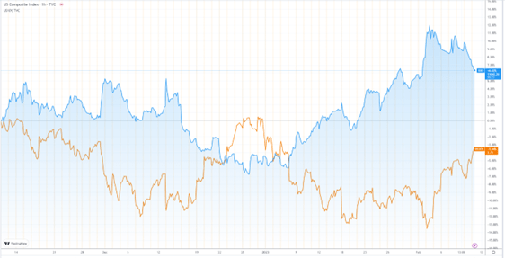 让我们来看看过去3个月的图表(纳斯达克是蓝色的,10年期美国国债是橙色的):