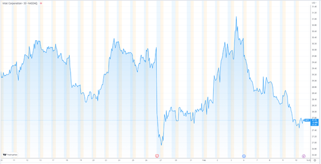 随着我们进入目前正在观察的收益季节,我们的主要目标一直是确定投资者对收益报告中的好消息和坏消息的反应。英特尔(NASDAQ:INTC)是本季度发布的首批收益报告之一,该公司曾是半导体行业的巨头,但在过去十年中一直处于艰难时期。我们读了英特尔的新闻稿,和许多其他投资者一样,我们认为这是该公司的又一个季度炸弹。营收同比下降约32%,公司营收和利润均大幅低于预期。然而,信不信由你,从下面这张股票的1个月图表中可以看到,在这份糟糕的收益报告发布后,该股实际上出现了反弹,用图表底部的红色字母“E”表示: