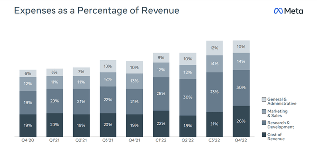 最后,在第四季度,我们看到研发支出下降。从Meta投资者演示的幻灯片中可以看出,第四季度是近年来研发收入占比首次下降的季度,这表明首席执行官马克·扎克伯格正在听取投资者对盈利能力的担忧。