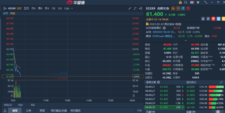 2月14日消息,药明生物发布财报预告后股价高开低走,现跌近5%。