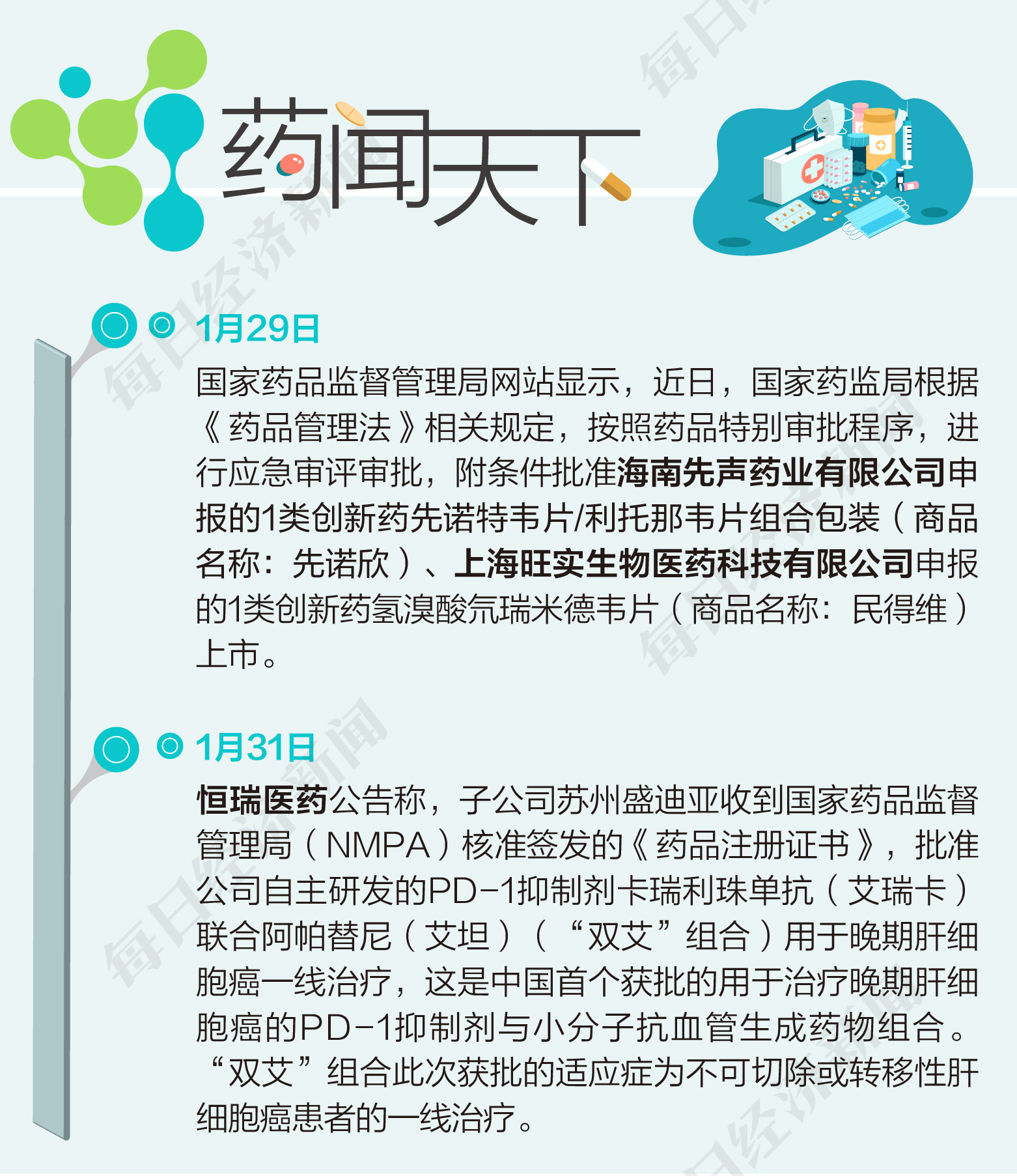 2023年1月31日,恒瑞医药公告称,子公司苏州盛迪亚收到国家药品监督管理局(NMPA)核准签发的《药品注册证书》,批准公司自主研发的PD-1抑制剂卡瑞利珠单抗(艾瑞卡)联合阿帕替尼(艾坦)(“双艾”组合)用于晚期肝细胞癌一线治疗,这是中国首个获批的用于治疗晚期肝细胞癌的PD-1抑制剂与小分子抗血管生成药物组合。