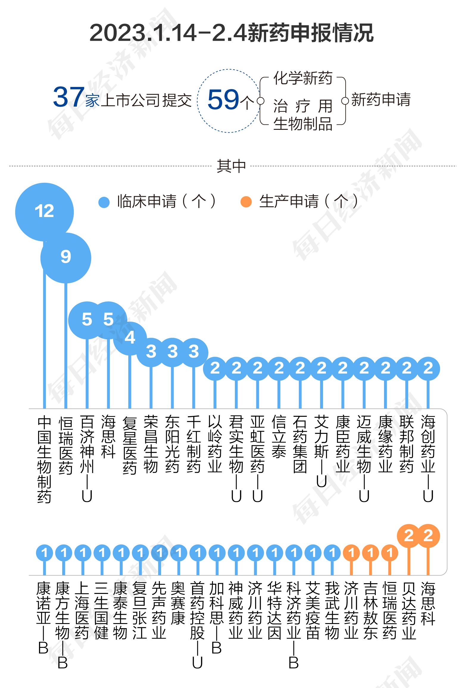 根据药渡数据,2023年1月14日至2月4日,国家药品监督管理局药品审评中心(CDE)共收到37家上市公司提交的59个化学新药、治疗用生物制品新药申请。