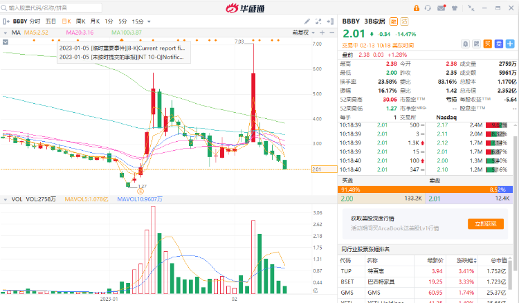 华盛资讯2月13日消息,3B家居盘中股价快速下挫14%。截至发稿,该股报2.01美元/股,成交量5961万股,换手率23.58%,振幅16.17%。五个交易日累计跌幅超65%。