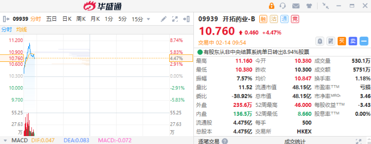 2月14日讯,开拓药业-B(09939)早盘一度涨超8%,截至发稿,涨4.47%,报10.76港元,成交额5751万港元。