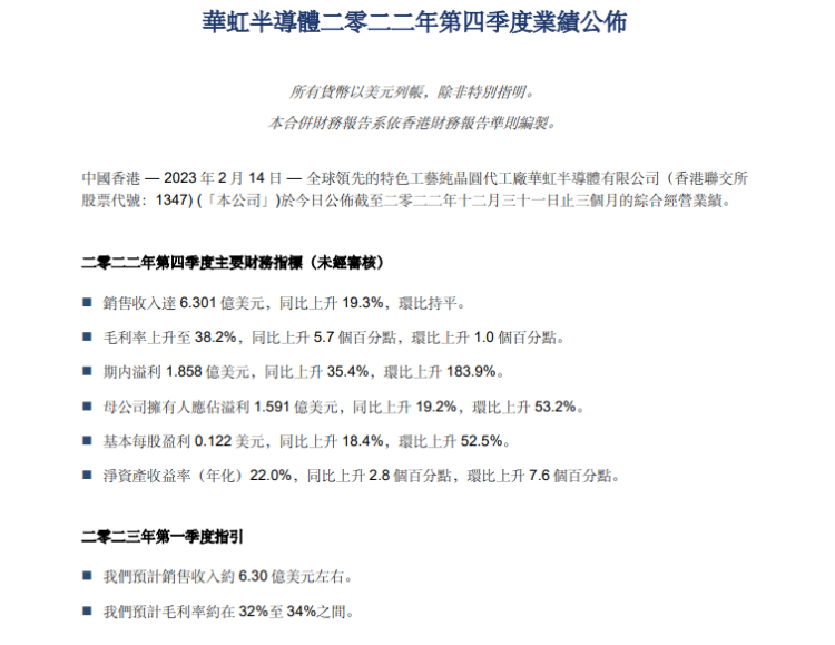 对此,公司总裁兼执行董事唐均君对第四季度业绩评论道:“尽管疫情影响、地缘冲突等极端、多元的不确定因素为半导体行业带来前所未有的挑战,华虹半导体在2022年第四季度仍保持稳中有升,销售收入达到6.301亿美元,连续十个季度刷新纪录,同比增长19.3%;也使得2022年全年销售收入达到了24.76亿美元,较2021年增长了51.8%。
