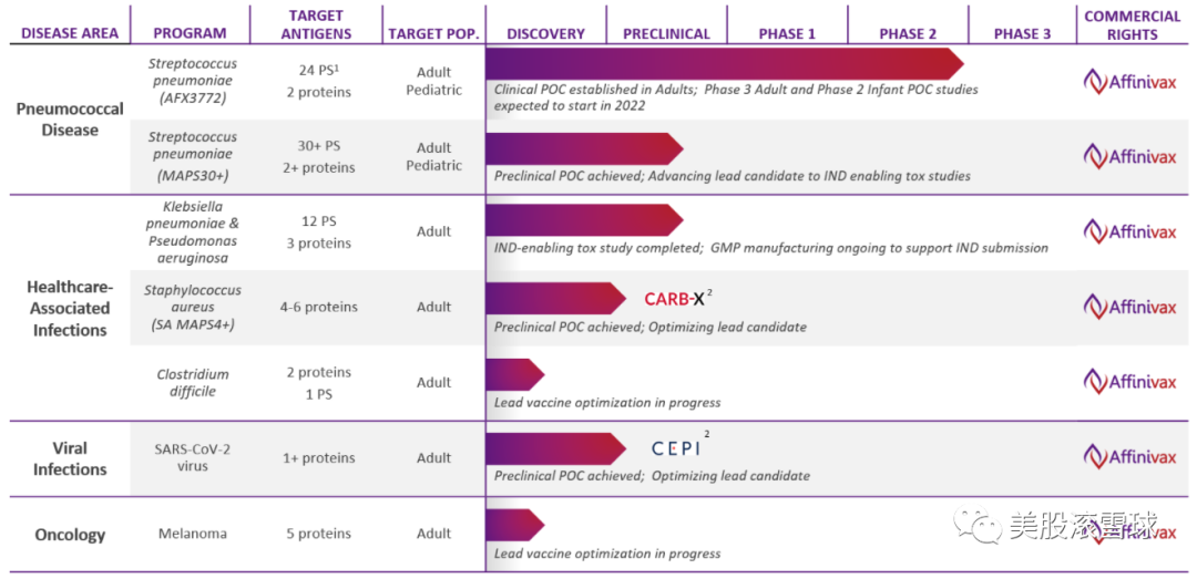 Affinivax的在研疫苗(AFX3772)包括24种肺炎球菌多糖加上两种保守的肺炎球菌蛋白,已经获得FDA的突破性疗法认定。其30多价肺炎球菌候选疫苗目前处于临床前开发阶段,适应症囊括了肺炎、脑膜炎、血液感染和鼻窦炎等。