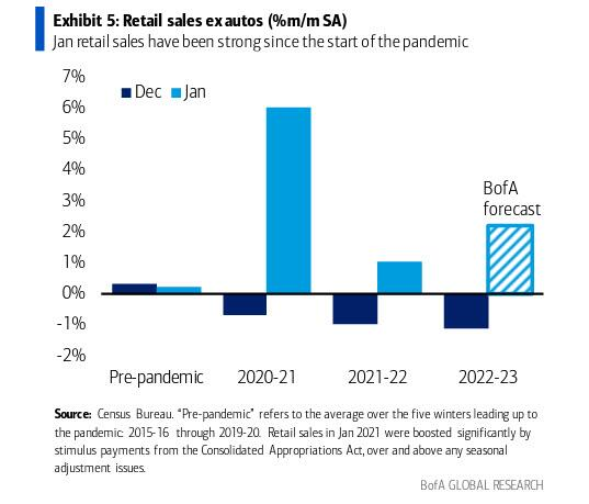 如果美银最新的信用卡消费数据是准确的,那么1月份零售销售将是一个“让你大吃一惊”的井喷式数据。