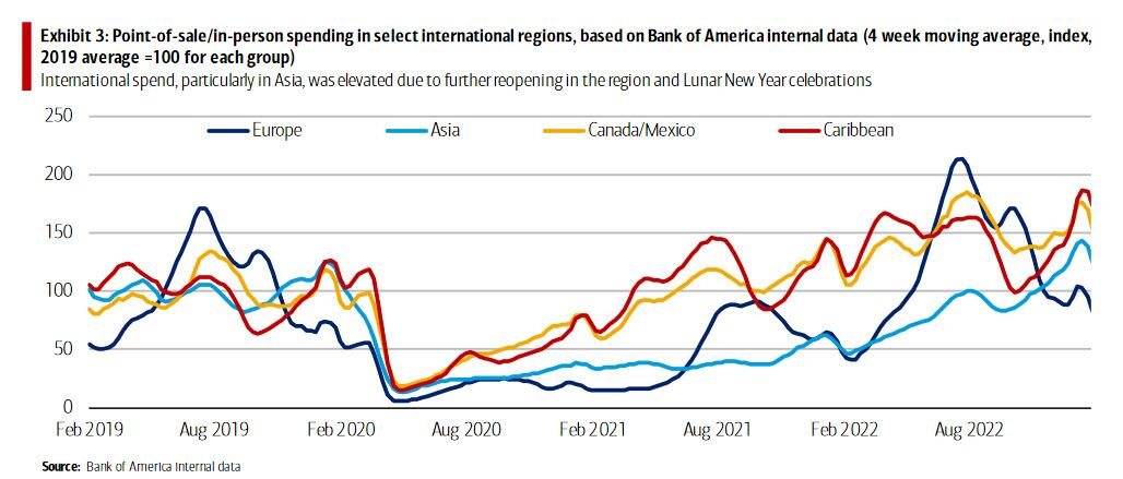 然而,世行经济学家也看到了2023年1月服务业支出真正走强的迹象:美银信用卡的每个家庭在航空公司的消费增加了3.5%,在餐馆和酒吧的消费增加了1.8%。受到重新开放和农历年假期的影响,与前两年相比,国际消费也有所增长,尤其是在亚洲。