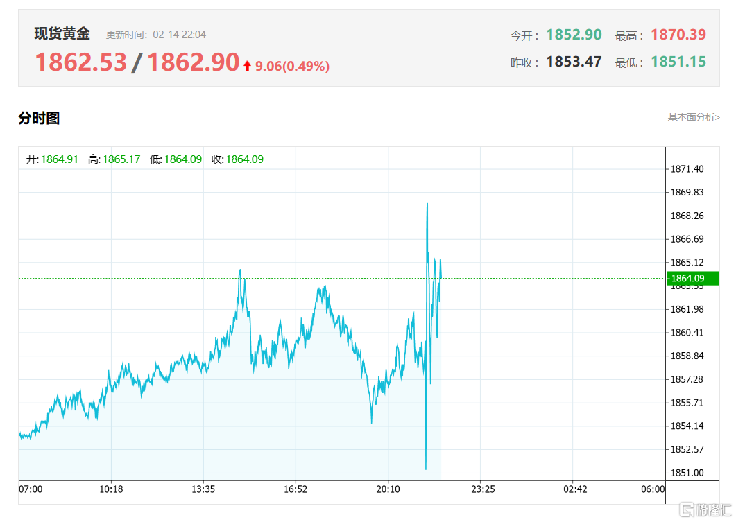 现货黄金短线下挫10美元,一度下挫至1850.21美元/盎司,现报1862.53美元/盎司.