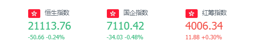 截至周二收盘,恒生指数跌0.24%,报21113.76点;国企指数跌0.48%,红筹指数涨0.3%。恒生科技指数跌1.01%,蔚来跌3.76%,小鹏汽车跌2.25%,腾讯跌2.07%;香港航天科技大涨14.75%。