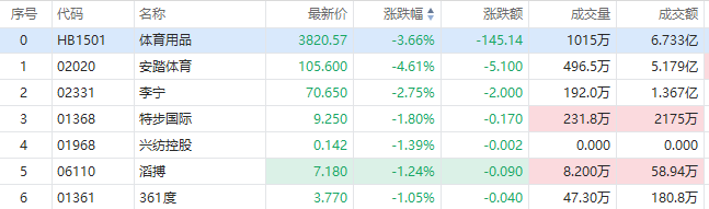 2月15日讯,港股体育用品股盘初走低,安踏体育跌超4%,滔搏、李宁、特步国际集体跟跌。消息面上,据港交所数据,安踏体育股东将公司8450万股股份转入香港中央结算系统。