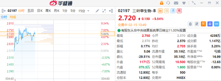 2月15日讯,三叶草生物-B(02197)今日早盘再涨超5%,现报2.69港元,成交额1.147亿港元。