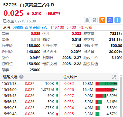 百度牛 $52725.HK ,收回价140港元,行使价138港元,换股比率500,杠杆比率11.8倍,市场上最贴牛