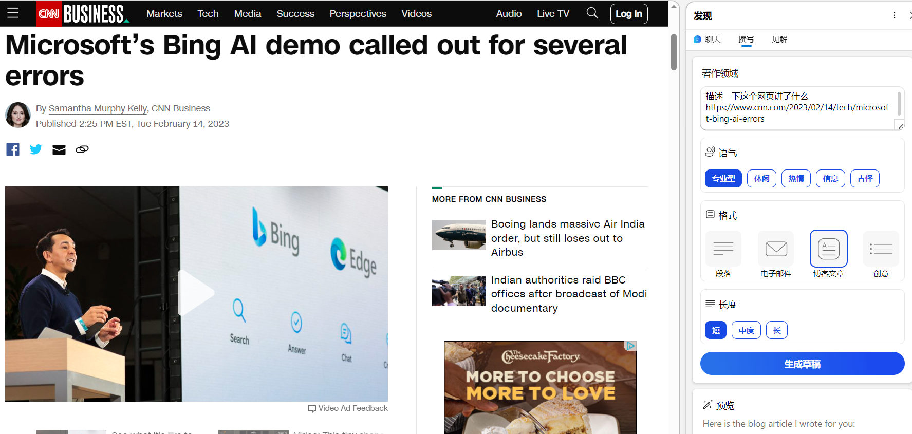 不过相较于本来就干瘪晦涩的财报,AI在处理日常新闻报道时会展现更高的主观性,例如对于CNN本周二有关“微软Bing演示中出错” 的报道,Bing的AI就能顺利地挑出报道中的信息点。