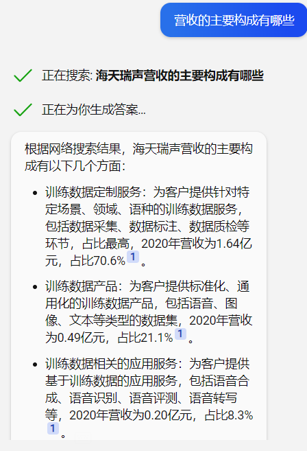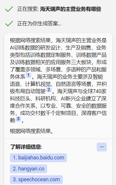 以近期在A股连续大涨的海天瑞声为例,Bing机器人在数秒之内就从公司官网、百家号、财经媒体、财经论坛上整合出一段简短的介绍。