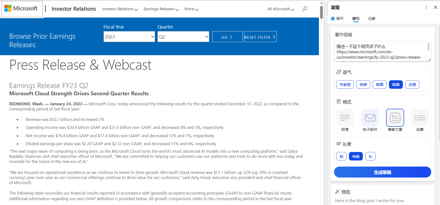 以下为Bing根据微软2023财季Q财报生成的中等长度信息博客
