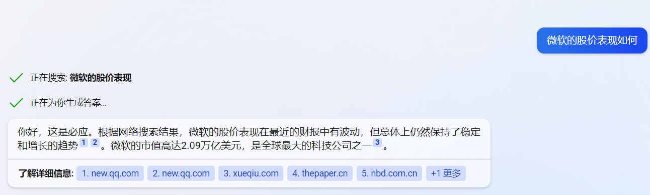 例如询问“微软最近股价表现”时,Bing提供的答案主要从国内的新闻网站抓取和拼接,所以内容的准确性完全取决于抓取的信息准确与否。