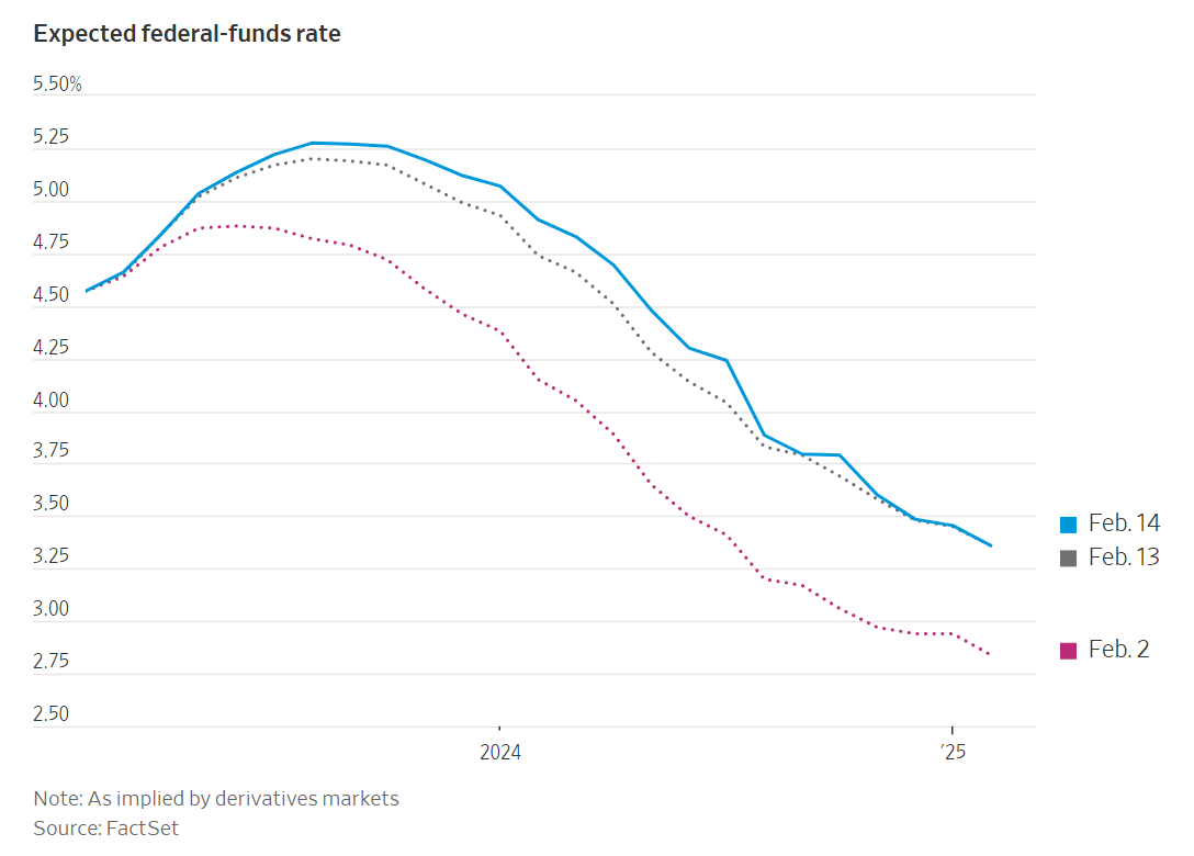 市场似乎终于在与美联储的长期博弈中退缩了。此前投资者押注通胀放缓将促使美联储在今年晚些时候开始降息,这推动1月份股市大涨,尽管美联储官员坚称,现在考虑放宽货币政策还为时过早。