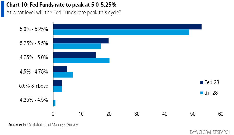 美国银行对全球基金经理的最新月度调查显示,只有不到5%的受访者预计利率峰值将超过5.5%,大多数人的共识是在5.25%左右。