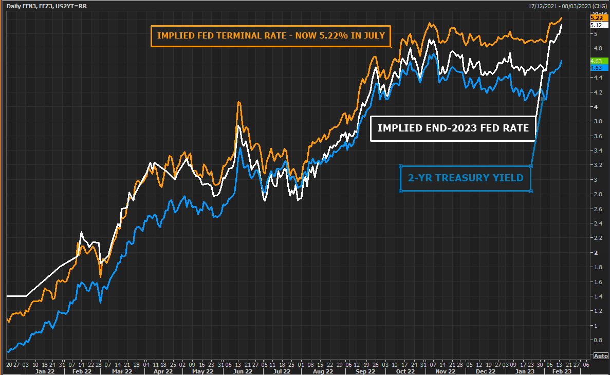 同样重要的是,市场现在预计到年底美联储联邦基金利率仍将高于5%,至少比当前水平高出一个百分点。这表明,任何关于美联储将转向宽松的想法正在一点一点地消退,这将对年初至今市场的乐观情绪形成致命打击。