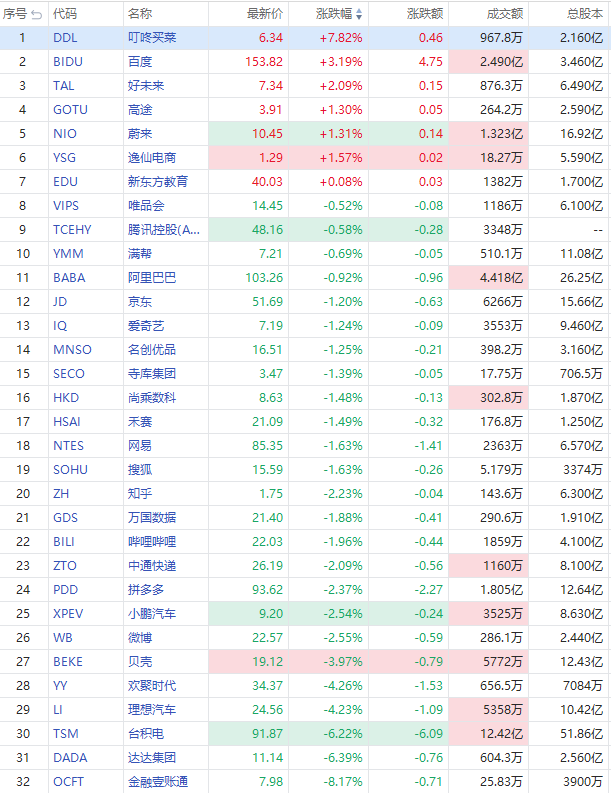 叮咚买菜绩后连涨两日,累计涨幅达29.45%,现报6.34美元每股,Q4净利扭亏为盈;百度涨超3%,多企业宣布接入“文心一言”;中概教育股继续强势,好未来涨超2%,高途、新东方教育跟涨。