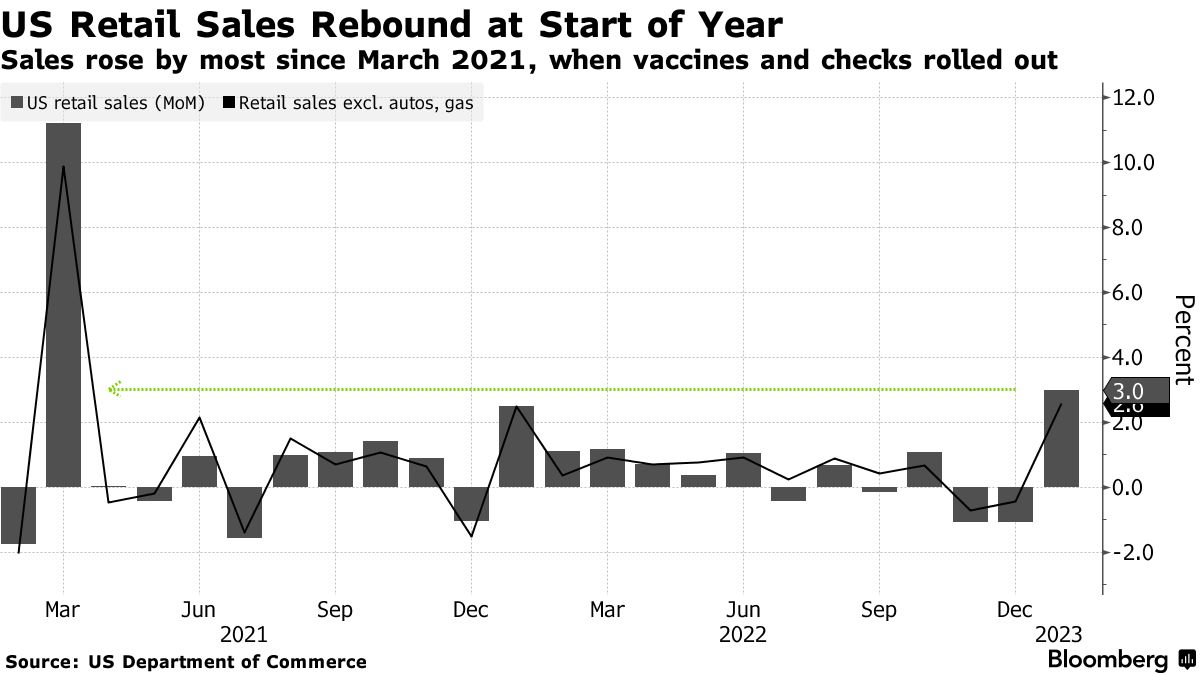 根据美国商务部的数据,1月份整体零售额增长了3%,为2021年3月以来的最大增幅。这些数据未经通胀调整,所有13个零售类别上个月都出现增长,其中汽车经销商、家具商店和餐馆领涨。