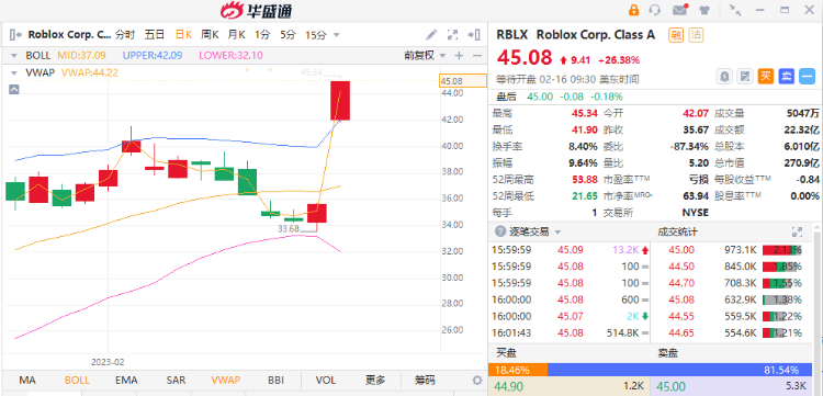 - Roblox Q4营收同比增长2%至5.79亿美元;归属于股东的净亏损为2.90亿美元。调整后EBITDA1.83亿美元,远超预期的9740万美元。Roblox首席财务官表示:“去年12月和今年1月的预订量增长明显加快,同比增长均超过20%。受财报提振,Roblox收涨逾26%。