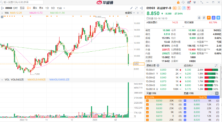 受此消息影响,2月16日一开盘,诺诚健华便低开低走,盘中跌幅一度超过3成,同时换手率亦较前几个交易日显著放大,投资者“夺门而出”的心态之迫切可见一斑。截至当天收盘,诺诚健华收报8.85港元,跌幅27.34%,全天换手率达到3.62%。