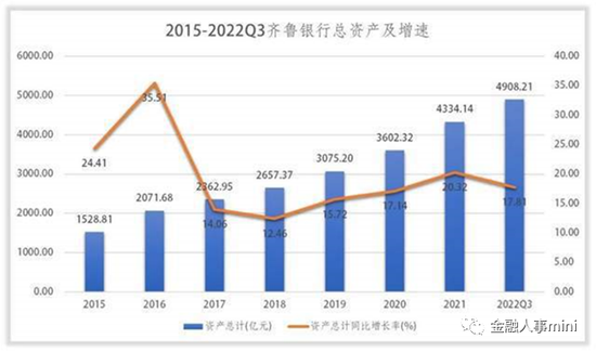 在1月发布的2022年业绩公告显示,齐鲁银行总资产为505,907,074千元,比本报告期初增长16.73%。齐鲁银行的总资产悄然跨过了5000亿大关。