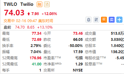 雲通信公司Twilio早盤大漲12%,此前Twilio表示將回購價值 10 億美元的股票。